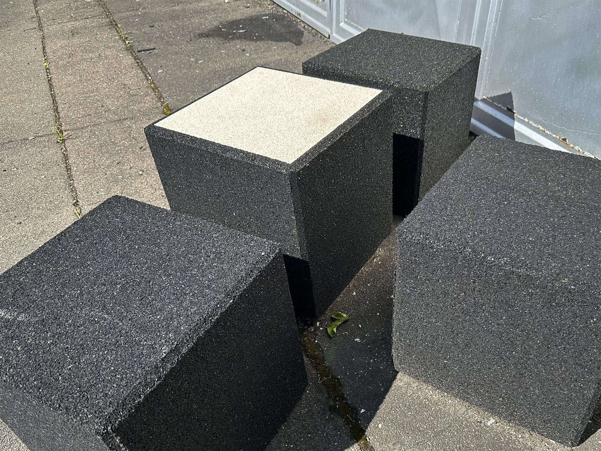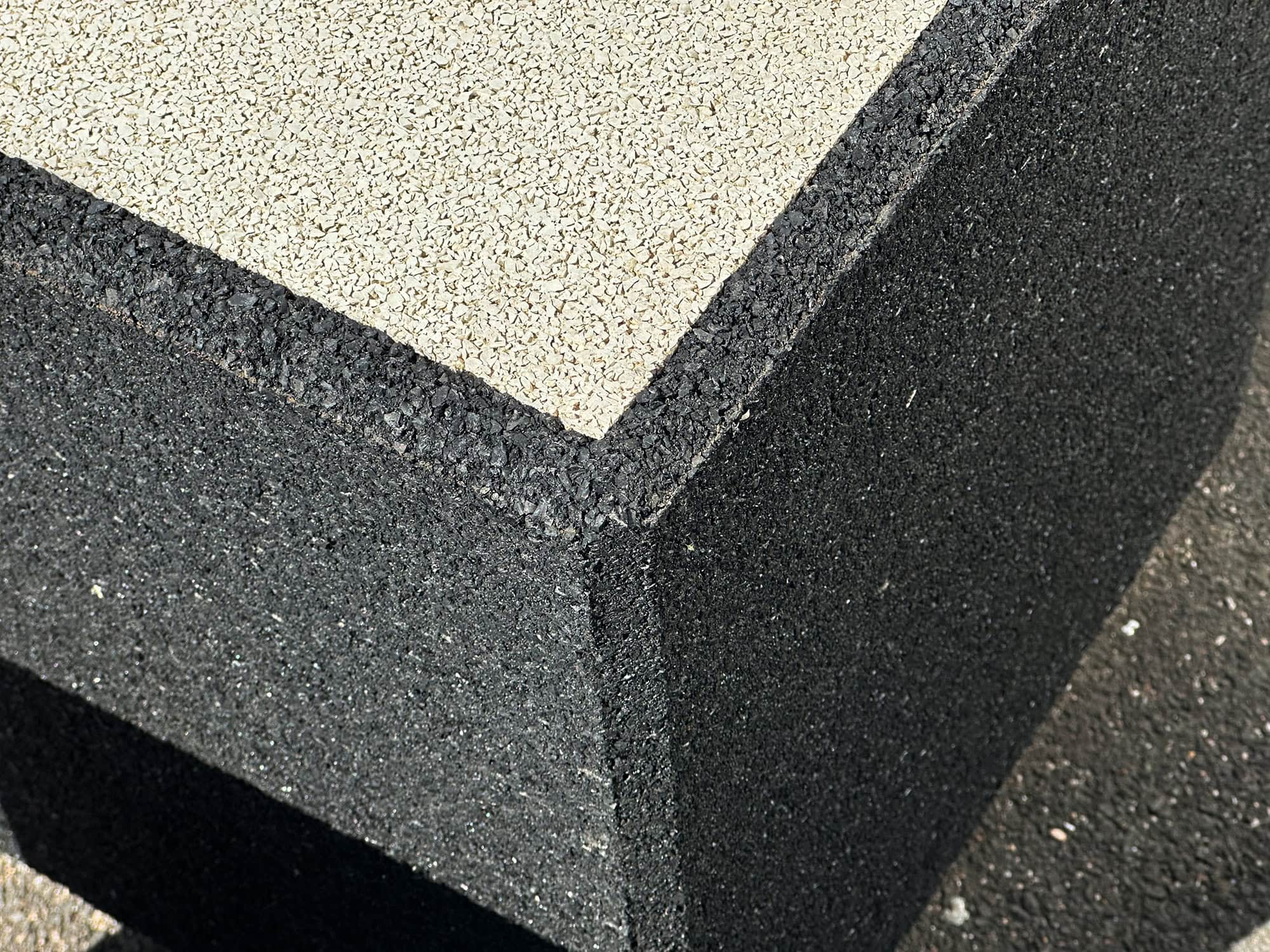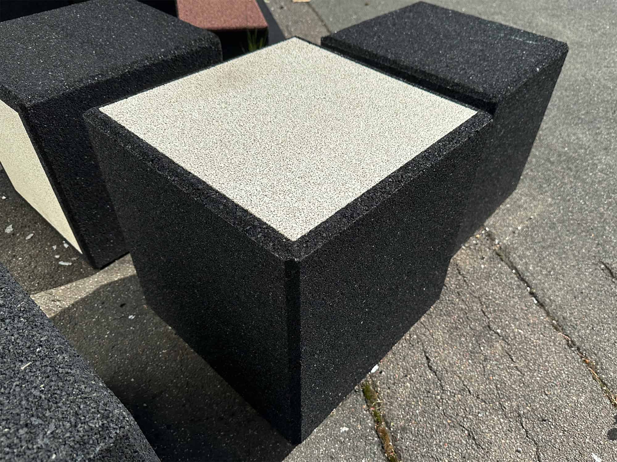 Ein Würfel aus Gummigranulat in den Maßen 40x40x40 cm (bei ca. 60 kg Gewicht), erstellt für ein Kunstprojekt auf Kundenwunsch. Die Einlagen-Sitzfläche kann in den Farbtönen grün, gelb, rot, blau und weiß ausgestaltet werden.