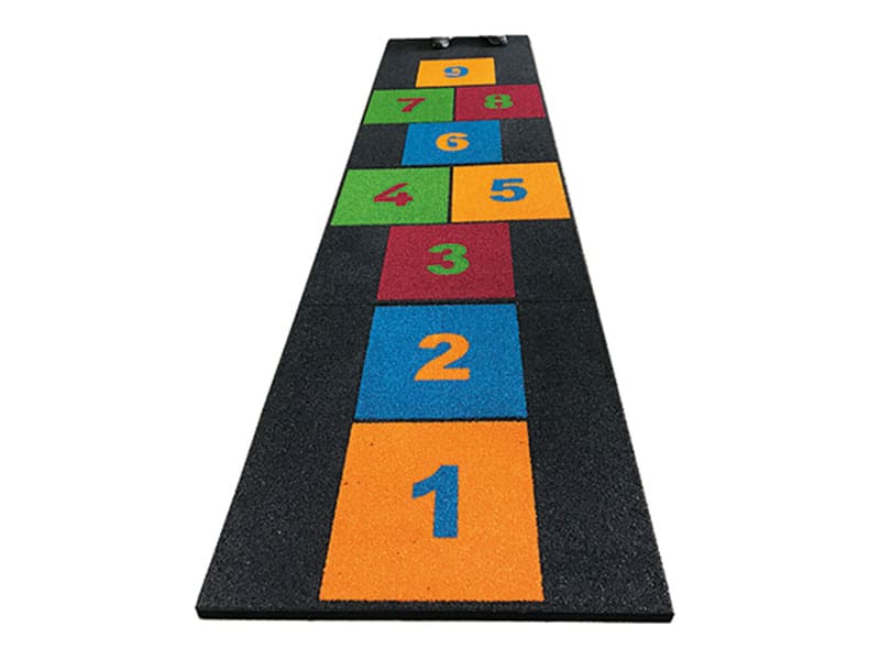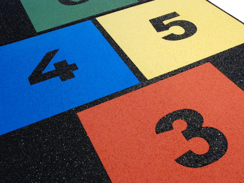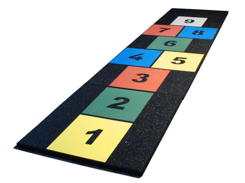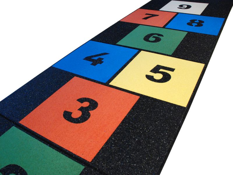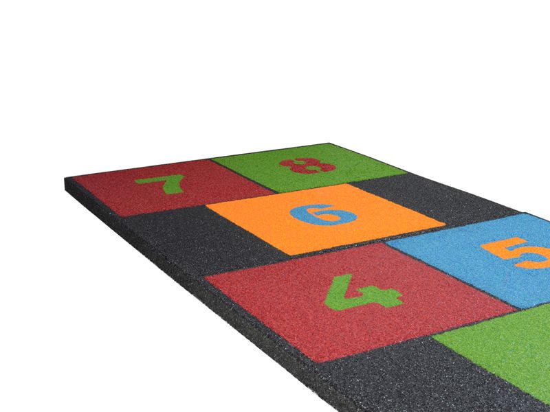 The well liked HopScotch game for children on a four soft rubber tiles. The tiles match the height of our 45 mm safety tiles. The inlays are made of colour intense artificial grass adding the colourfull spot on every playground. The tiles are great add ons on safety areas but they are themselves not tested to a specific fallheight – thus to be placed outside of fallheight areas.