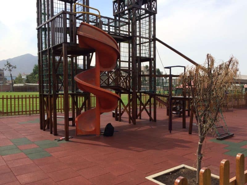Safety tiles protect against serious head injuries in the event of a fall. In a standardized test procedure, a test institute determines fall heights for fall protection mats at which serious head injuries are avoided. Select the appropriate safety tile based on the possible fall height from your playground equipment. Find the place where a child should still be able to stand on the play equipment (foot position) and measure the height there. For example, determine a possible fall height of 1.7 m, the 45 mm thick fall protection plate is no longer sufficient and you need to choose the 60 mm thick fall protection mat, which has been tested by a test institute for a fall height of 2.0 m.