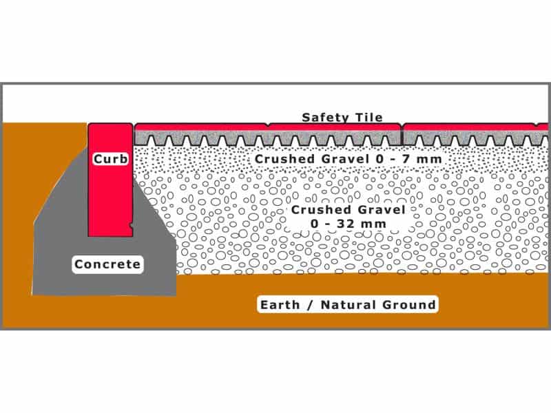 Nutzen: konsequente Sicherheit auf Sportplätzen u. Kinderspielplätzen – keine Splitter, keine harten oder scharfen Kanten. Verlegung: Der Randstein wird min. bis 2 cm über die Einkerbung in Beton gesetzt. Materialbedingte Toleranzen müssen bei der Verlegung beachtet werden.